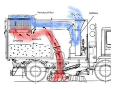 LKW-Kehrmaschinen sind mit einer hohen Saugleistung ausgestattet und erlauben so auch wegen der räumlichen Baufreiheit den Einbau eines besonderen, trocken arbeitenden Filters im Saugluftstrom zur Feinstaubrückhaltung bei Gewährleistung guter Kehricht-Aufnahmeleistungen. Zum Einsatz kommt ein kompakt gebauter Filter der individuell auf die Förderleistung des im Kehraufbau vorhandenen Lüfters ausgelegt ist. Der Filter wird im oberen Heckbereich des Kehrbehälters montiert und ist mit einer selbsttätigen pneumatischen Abreinigungseinrichtung ausgestattet, die eine kontinuierliche, periodische Reinigung der Filterelemente im Gegenstromprinzip technisch gewährleistet. Die Filterelemente sind unempfindlich gegenüber Feuchtigkeit und der im Kehricht enthaltenen Stoffe. Die vom Filter abgeschiedenen Partikel werden direkt in den Kehrichtbehälter abgeschieden und mit dem Kehricht entsorgt.